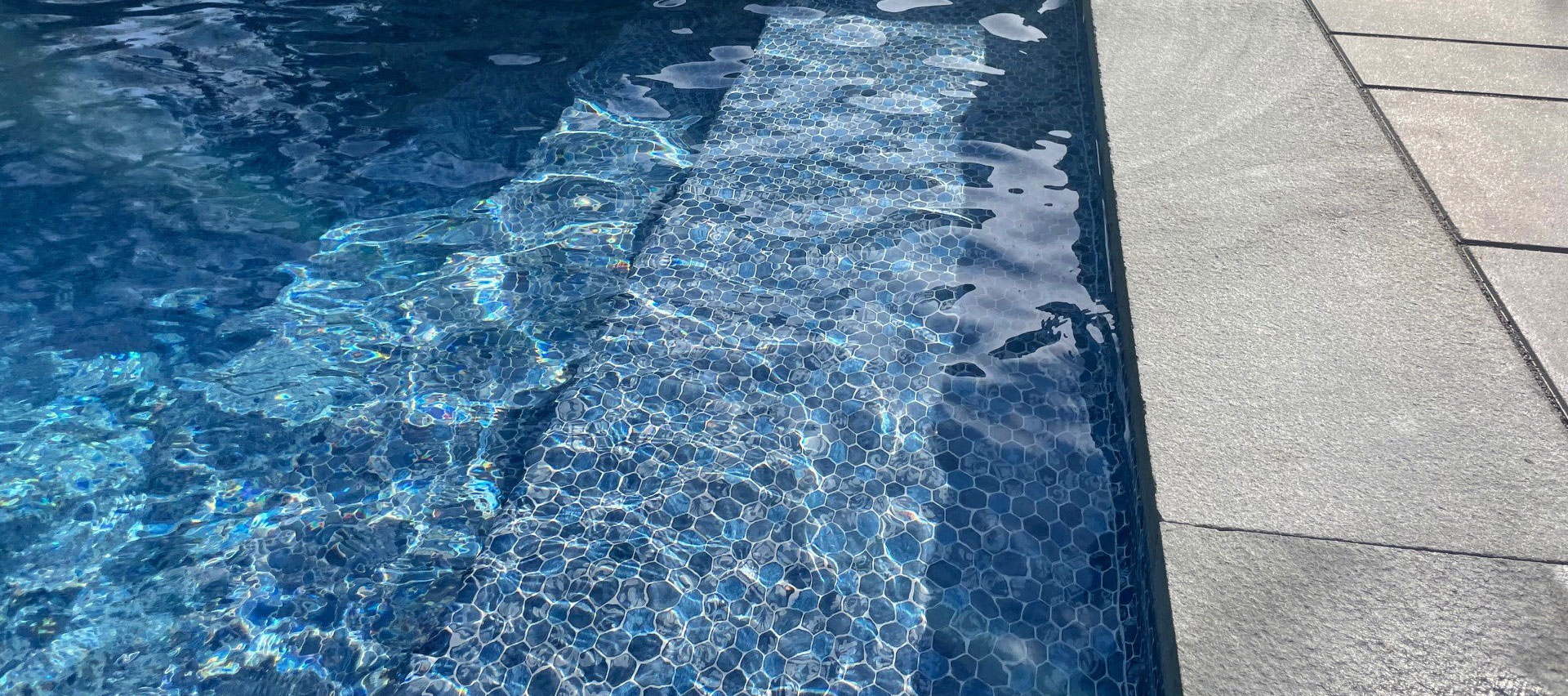 A fiery blue-grey hexagonal mosaic with a rustic motif creating beautiful blue waters. Printed on stone clay coloured pool liner material enhanced with Poolside’s exclusive aquashimmer feature for sparkling effect. Engineered with added chemical and UV protection.